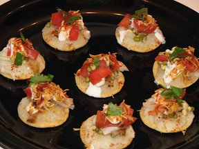 Well, older wiser, more mature… and more easy going (something my husband is trying hard to inculcate). I whip up starers in no time now. The secret? Loosen up the definition of starters… and loosen up my perceptions of the perfect starter. Perfect starter = what people enjoy + what I can prepare with less effort!! So I grate a little cheese over Monacos (a very old trick, but in my earlier books it was too easy and hence not happening) and garnish with a wee bit of mint, fresh cut vegetables (called crudites) like spring onion, carrots, radish, cucumber and with that prepare dips by mixing up sauces and other market available dips, serve our good ol Indian chaat options (sev puri is my favourite now), cut up chicken cubes and throw them in a wok with some oil, salt and chilly flakes (how easy is that!!)…