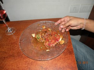 I substituted the cambozola cheese with Gorgonzola. I went to Godrej Nature’s Basket and didn’t find Cambozola (very sad), then googled and found out I could use Gorgonzola (http://www.gourmetsleuth.com/Dictionary/C/Cambozola-cheese-5786.aspx) … so i did. I managed all the other ingredients fine. But forgot the unsalted butter. So I went ahead with normal butter, and went easy on the salt. I used normal white wine, didn’t bother with a cooking wine etc. And for the sauce, i didn’t follow exact measurements… there may have been a little more wine! (HIC!) 🙂 Just tried to get the consistency right.